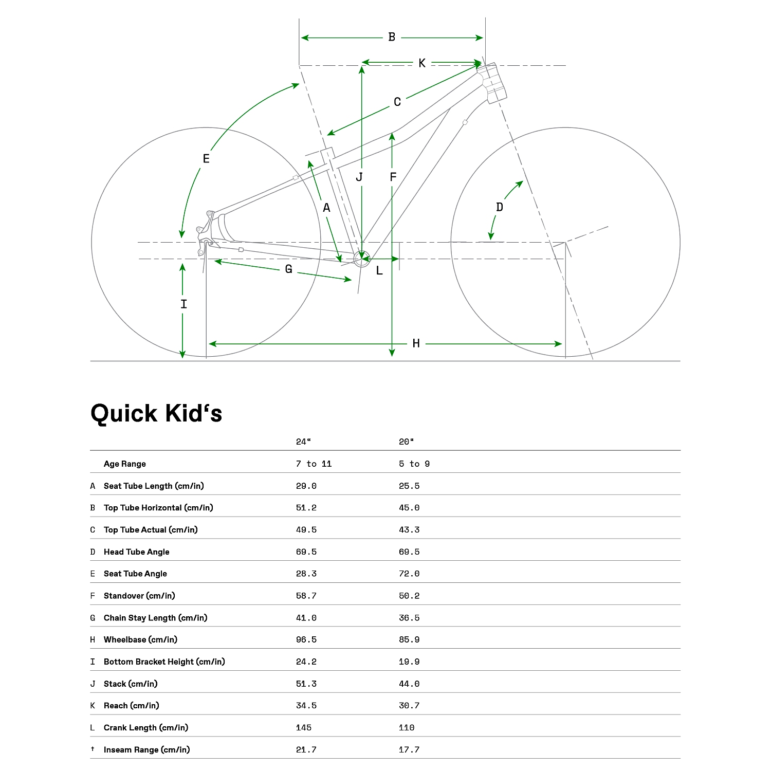 Fact Sheet of Cannondale KIDS QUICK – 24" Kids Bike – 2023 – iridescent Product Name: Cannondale KIDS QUICK – 24" Kids Bike – 2023 – iridescent Manufacturer: Cannondale Bikes Item Code: CAD577639 activity: Cycling gender: kids material: Aluminium usage bikesport: City hubs: KT Alloy ,QR spokes: Steel ,14g rims: Cannondale ,28h chain: KMC Z7 cassette: Sunrace shifter: microSHIFT ,low-torque Twist Shift rear derailleur: microSHIFT M21S ,7-speed bottom bracket: Cartridge ,square taper chainring ratio: 30 crankset: Prowheel Pro-V30 ,145mm brakes: Promax V-Brake seat post model: Alloy ,25.4mm saddle: Cannondale Kid's Comfort handle bar: Lightweight Alloy ,25.4mm ,580mm stem: Aluminium ,30mm fork: Rigid ,SmartForm C3 Alloy headset: FSA ,1-1/8" Ahead frame: SmartForm C3 Alloy groupset: microSHIFT gear ratio: 11-28 number of gears – front: 1 shifting system: 7-speed shifting actuation: Mechanical recommended body height: 122-145cm age recommendation: 7 – 12 brake type: Rim Brake wheel size: 24" (507mm) bike special accessories: Kickstand grips: Cannondale Kid's Comfort seatpost: Seatpost rigid tires: Kenda Small Block 8 ,24 x 1.5" brake actuation: Mechanical Model year: 2023 Collection: Full year Color: Beige fork construction: Rigid Fork manufacturer item code: C51702U cable routing: internal Manufacturer page: http://www.cannondale.com/eur_de |