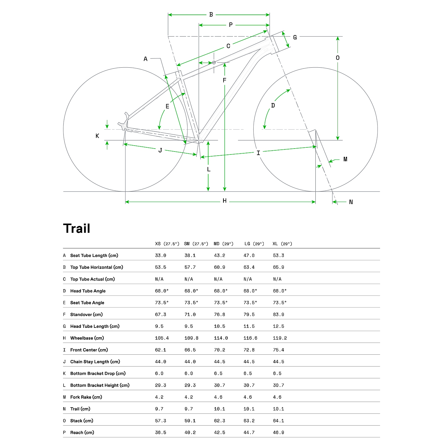 A slack 68° head angle creates exceptionally stable handling so that you can charge the descents with confidence. The smaller sizes of Trail roll on 27.5″ wheels, while the larger sizes come with 29″ wheels to deliver the best blend of fit, fast and fun for every rider.