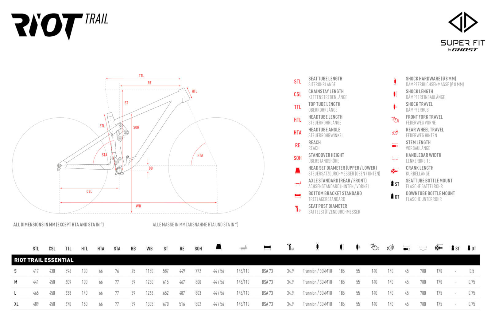 Fact Sheet of Ghost RIOT TRAIL Essential – Mountain Bike – 2023 – dark grey / rusty orange Product Name: Ghost RIOT TRAIL Essential – Mountain Bike – 2023 – dark grey / rusty orange Manufacturer: Ghost Bikes Item Code: GOS608796 activity: Cycling gender: men material: Aluminium usage bikesport: MTB ,Trail hubs: Shimano HB-MT400-B 15x110mm ,Shimano FH-MT510-B 12x148mm spokes: DT Swiss 2.0 rims: WTB ST Light i30 chain: Shimano Deore CN-M6100 cassette: Shimano SLX CS-M7100 shifter: Shimano BL-MT501 rear derailleur: Shimano XT RD-M8100 bottom bracket: Shimano BB-MT801 crankset: Shimano SLX FC-M7100 32T brakes: Shimano BR-MT520 ,Rotor Shimano SM-RT70 180mm seat post model: Ghost Alpha 1 34.9mm ,125 (S) ,150 (M) ,170 (L/XL) saddle: WTB Volt handle bar: Ground Fiftyone ,31.8mm ,760/15 (S) ,780/15 (M-L) ,780/40 (XL) stem: Ground Fiftyone ,31.8mm fork: Fox 34 Float Rhythm headset: Acros Blocklock 135° AZX-582 frame: RIOT AL groupset: Shimano gear ratio: 10-51 number of gears – front: 1 shifting system: 12-speed shifting actuation: Mechanical brake type: Disc Brake wheel size: 27 ,5" / 650B (584mm) ,29" (622mm) grips: WTB Wafel shock: Fox Float DPS Performance LV EVOL ,140mm seatpost: Dropper post frame type: Full Suspension travel fork: 140mm tires: Schwalbe Nobby Nic Super Ground Addix Speedgrip 2.4 brake actuation: Hydraulic Model year: 2023 Collection: Full year Color: Grey fork construction: Classic Suspension Fork manufacturer item code: 31RI5 cable routing: external Manufacturer page: http://www.ghost-bikes.com/ |
