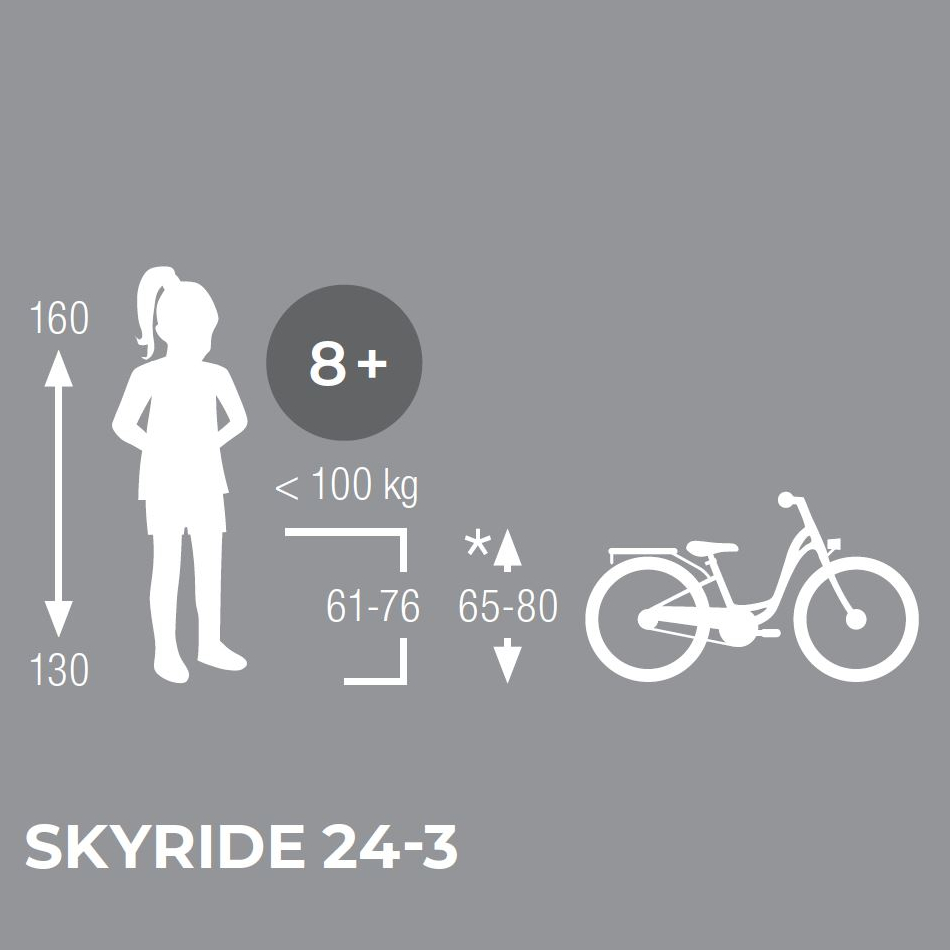 For the current generation of PUKY’s popular SKYRIDE girls’ bike series, all parts were carefully selected to guarantee a long service life. With its dimensions, the 24 inch version is the ideal everyday companion for young people from 8 years or 130 cm tall.