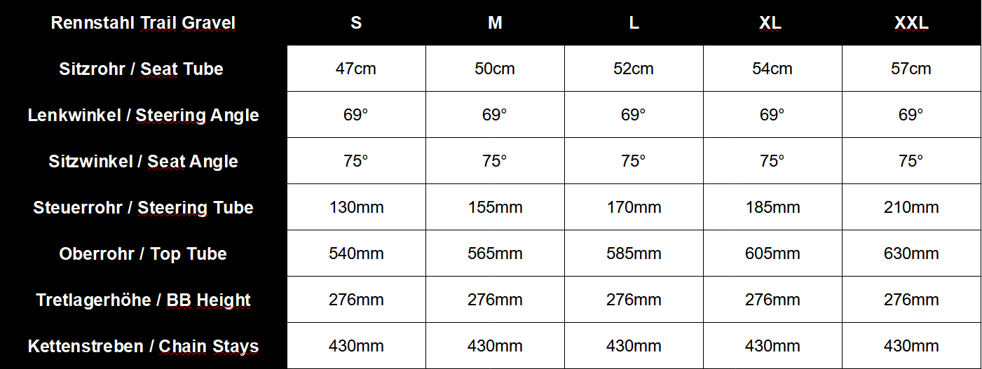 Fact Sheet of Rennstahl 853 Trail Gravel SE – Gravel Bike – 2024 Product Name: Rennstahl 853 Trail Gravel SE – Gravel Bike – 2024 Manufacturer: Rennstahl Bikes Item Code: RSB604842 activity: Cycling gender: men material: Steel usage bikesport: Allroad / Gravel cassette: Campagnolo EKAR shifter: Campagnolo EKAR rear derailleur: Campagnolo EKAR chainring ratio: 38 crankset: Campagnolo EKAR brakes: Campagnolo EKAR ,160/160mm wheels: Mavic Allroad S seat post model: Rennstahl Carbon saddle: Selle Italia SLR Super Flow X-Cross bar tape: Selle Italia Smoo Tape Gran Fondo handle bar: Syntace CDR AL stem: Parapera AL fork: Rennstahl Gravel Carbon headset: Acros frame: Rennstahl 853 Trail Gravel groupset: Campagnolo gear ratio: 9-42 number of gears – front: 1 shifting system: 13-speed shifting actuation: Mechanical brake type: Disc Brake wheel size: 28" (622mm) seatpost: Seatpost rigid tires: Schwalbe G-One Allround ,40-622 brake actuation: Hydraulic Model year: 2024 Color: Black fork construction: Rigid Fork cable routing: internal Manufacturer page: http://www.rennstahl-bikes.de/ |