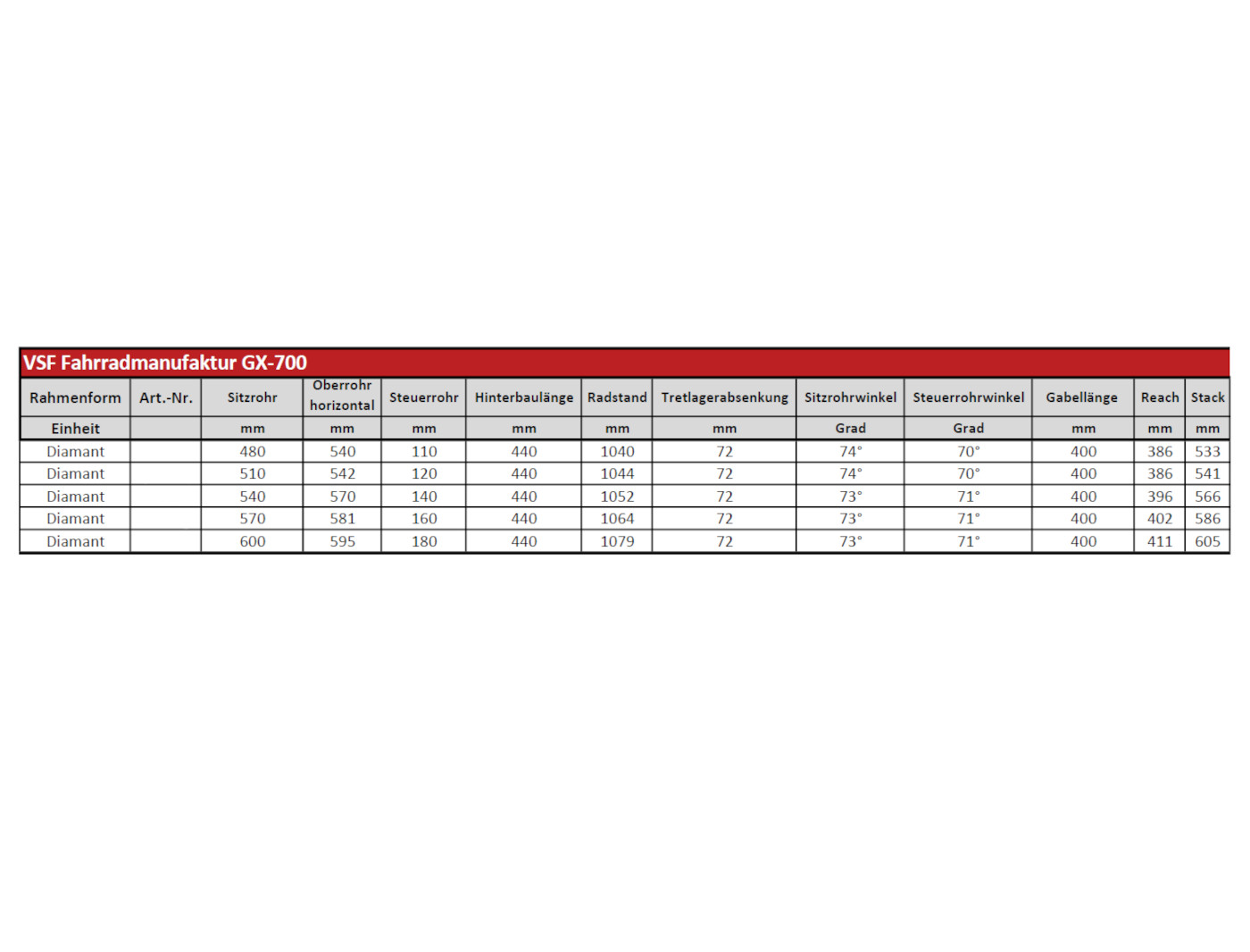 Fact Sheet of vsf fahrradmanufaktur GX-700 Apex XPLR AXS – Gravel Bike – 2024 – wet terra matt Product Name: vsf fahrradmanufaktur GX-700 Apex XPLR AXS – Gravel Bike – 2024 – wet terra matt Manufacturer: vsf fahrradmanufaktur Item Code: VSF669517 activity: Cycling gender: men material: Steel usage bikesport: Allroad / Gravel hubs: Shutter Precission PL-7 ,12 x 100 mm ,hub dynamo ,CL ,KT ,12x142mm ,CL spokes: Niro 2.0mm rims: Ryde Dutch 19 ,Disc ,32 H chain: SRAM Apex cassette: Sram XPLR PG-1231 ,12-speed shifter: SRAM Apex XPLR AXS rear derailleur: SRAM Apex XPLR AXS bottom bracket: SRAM DUB ,BSA chainring ratio: 40 crankset: SRAM Apex ,170 mm brakes: SRAM Apex ,160/160mm seat post model: Levelnine ,Aluminium ,27.2 mm ,300 mm saddle: Selle Italia Terra Argo bar tape: Fizik Vento Solocush Tacky ,2.7mm handle bar: Levenine Gravel ,Aluminium ,Flare 12° ,440 / 440 / 440 / 460 / 480mm stem: Levelnine ,Aluminium ,6° ,90 / 90 / 90 / 110 / 110mm fork: vsf fm Gravel ,Aluminium ,12x100mm ,Flatmount headset: Acros AZX-228 ,1 1/8" – 1 1/2" ,External Cup frame: 25 CrMo 4 ,double butted groupset: SRAM gear ratio: 11-44 number of gears – front: 1 shifting system: 12-speed shifting actuation: Electronic brake type: Disc Brake wheel size: 28" (622mm) seatpost: Seatpost rigid tires: Schwalbe G-One R ,45-622 brake actuation: Hydraulic Model year: 2024 Collection: Full year Color: Beige fork construction: Rigid Fork weight: 11300g cable routing: external Weight Source: Manufacturer Manufacturer page: https://www.fahrradmanufaktur.de/ |