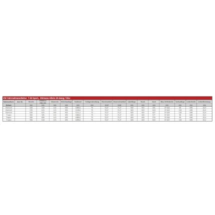 Fact Sheet of vsf fahrradmanufaktur T-500 Disc Alfine – Women Touring Bike – 2023 – ebony matt Product Name: vsf fahrradmanufaktur T-500 Disc Alfine – Women Touring Bike – 2023 – ebony matt Manufacturer: vsf fahrradmanufaktur Item Code: VSF608465 activity: Cycling gender: women material: Steel usage bikesport: Trekking hubs: Shutter Precission PL-8 ,Hub Dynamo ,Shimano Alfine 8-speed spokes: Niro 2.0mm rims: Schürmann YAK19 Disc Aluminium chain: KMC Z1 EPT cassette: Shimano sprocket shifter: Shimano Alfine rear derailleur: Shimano Alfine ,8-speed bottom bracket: Thun Tango ML chainring ratio: 42 crankset: Lasco Aluminium ,170mm brakes: Shimano Altus BR-MT200 ,160mm seat post model: Levelnine ,Aluminium ,27.2mm ,300mm saddle: Selle Royal Ariel handle bar: Levelnine ,Trekking ,Aluminium ,640mm stem: Levelnine ,Aluminium ,25.4mm fork: 28" Aluminium headset: Ritchey Comp Logic V2 frame: 25 CrMo 4 groupset: Shimano gear ratio: 20 number of gears – front: 1 shifting system: 8-speed ,Internal Gear Hub shifting actuation: Mechanical bike extras: with Lighting System ,with Fender ,with Carrier brake type: Disc Brake wheel size: 28" (622mm) bike special accessories: Racktime Light-it rear rack ,Busch & Müller LED light ,Pletscher Zoom kickstand ,SKS fenders bike lights: Busch & Müller Lumotec Eyc ,50 LUX ,Busch & Müller ,Toplight 2C grips: Herrmans Grit D33 seatpost: Seatpost rigid pedals: Marwi SP-823 tires: Schwalbe Marathon Efficiency ,40-622 ,reflex brake actuation: Hydraulic Model year: 2023 Color: Black fork construction: Rigid Fork weight: 14500g cable routing: external Weight Source: Manufacturer Manufacturer page: https://www.fahrradmanufaktur.de/ |